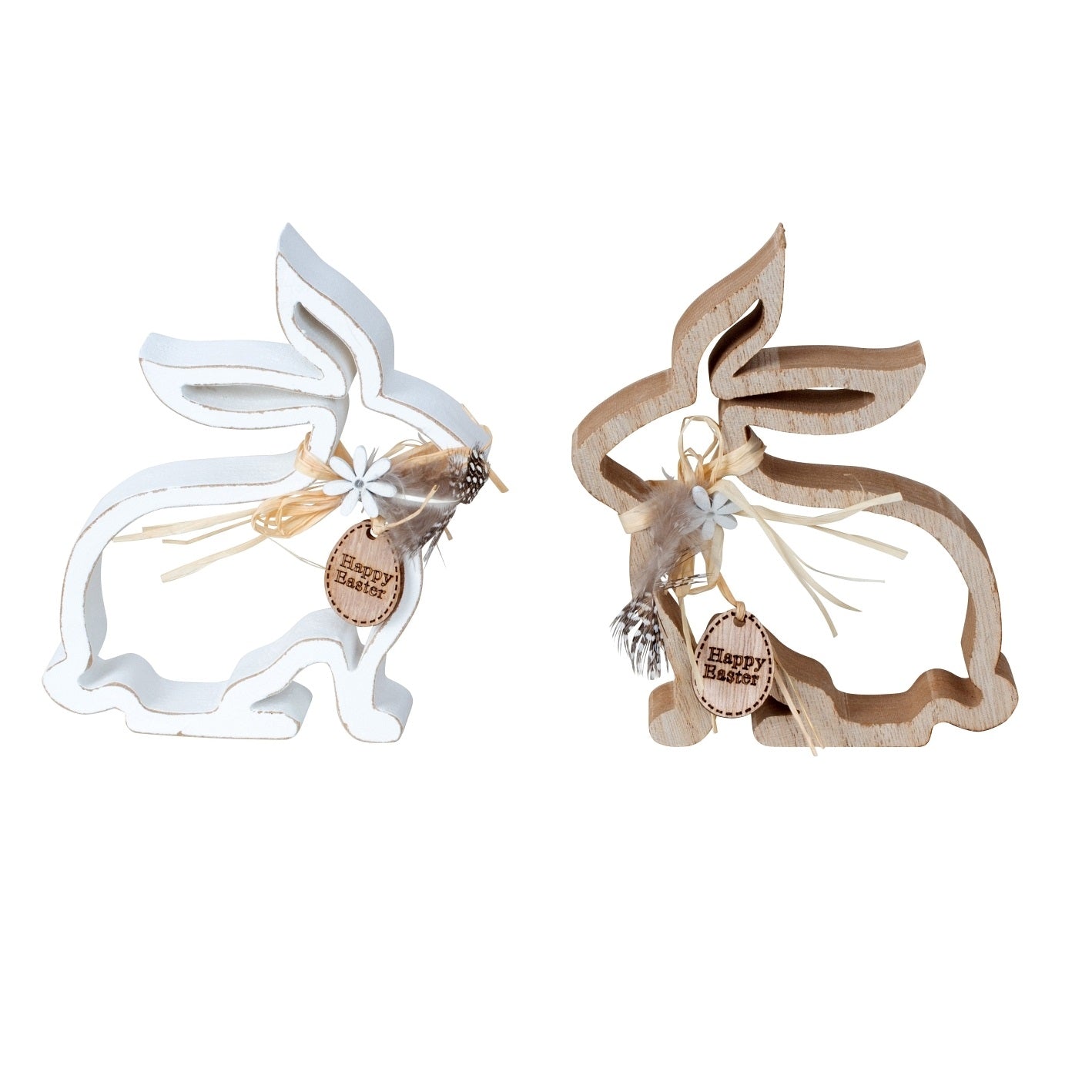 Diese Hasen-Silhouetten aus Holz bringen mit kleinen Blümchen und zarten Federn natürliche Osterstimmung in dein Zuhause. Schlicht, liebevoll und perfekt für den Frühling.